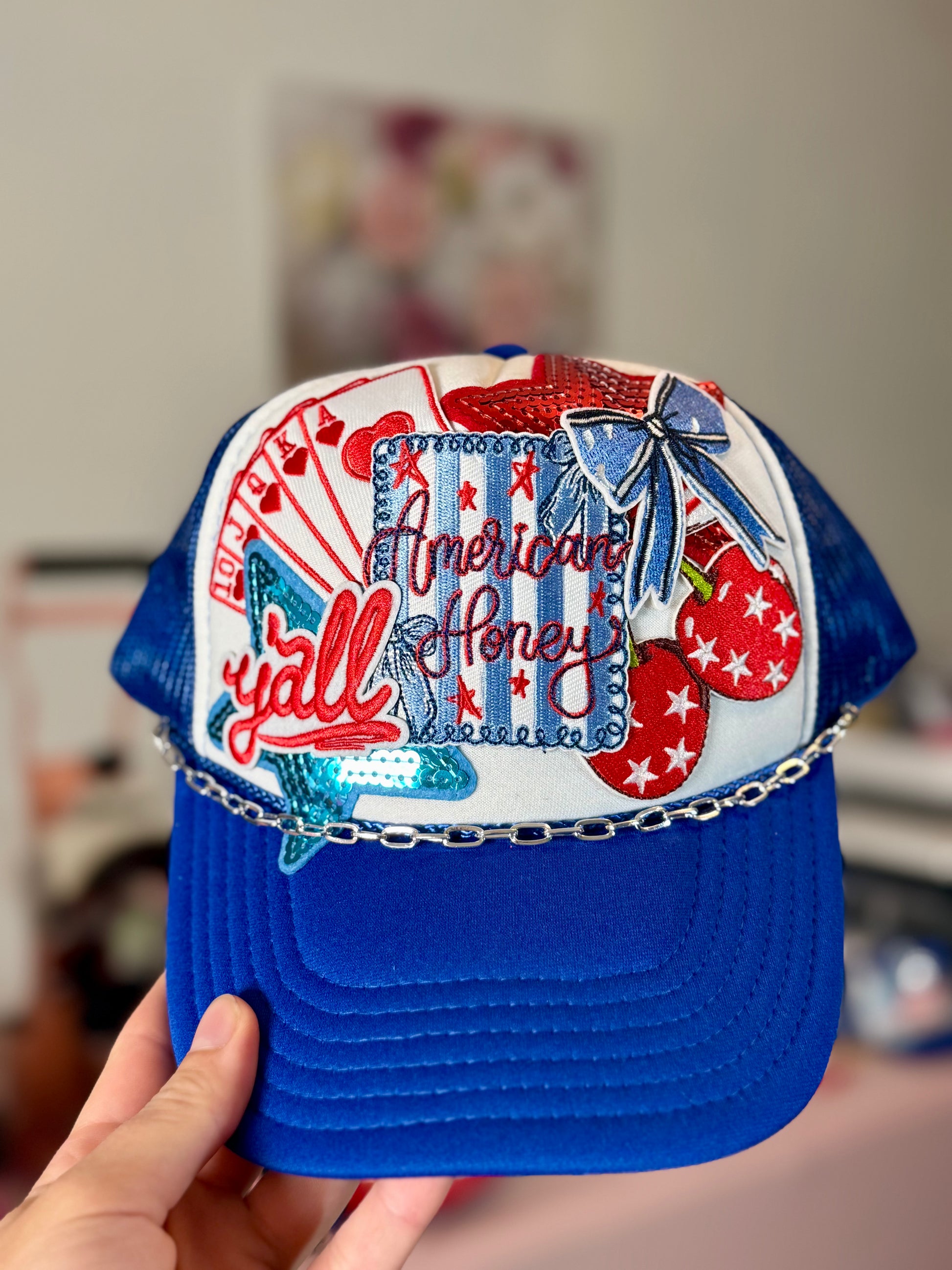 Turn heads and show your southern sass with our American Honey Y’all Trucker Hat! This vibrant royal blue mesh hat is decked out in red, white, and sparkle—with playful patches featuring poker cards, stars, cherries, a bow, and sequined accents. The “American Honey” marquee patch steals the show, and the added silver chain detail gives it that extra boujee flair.