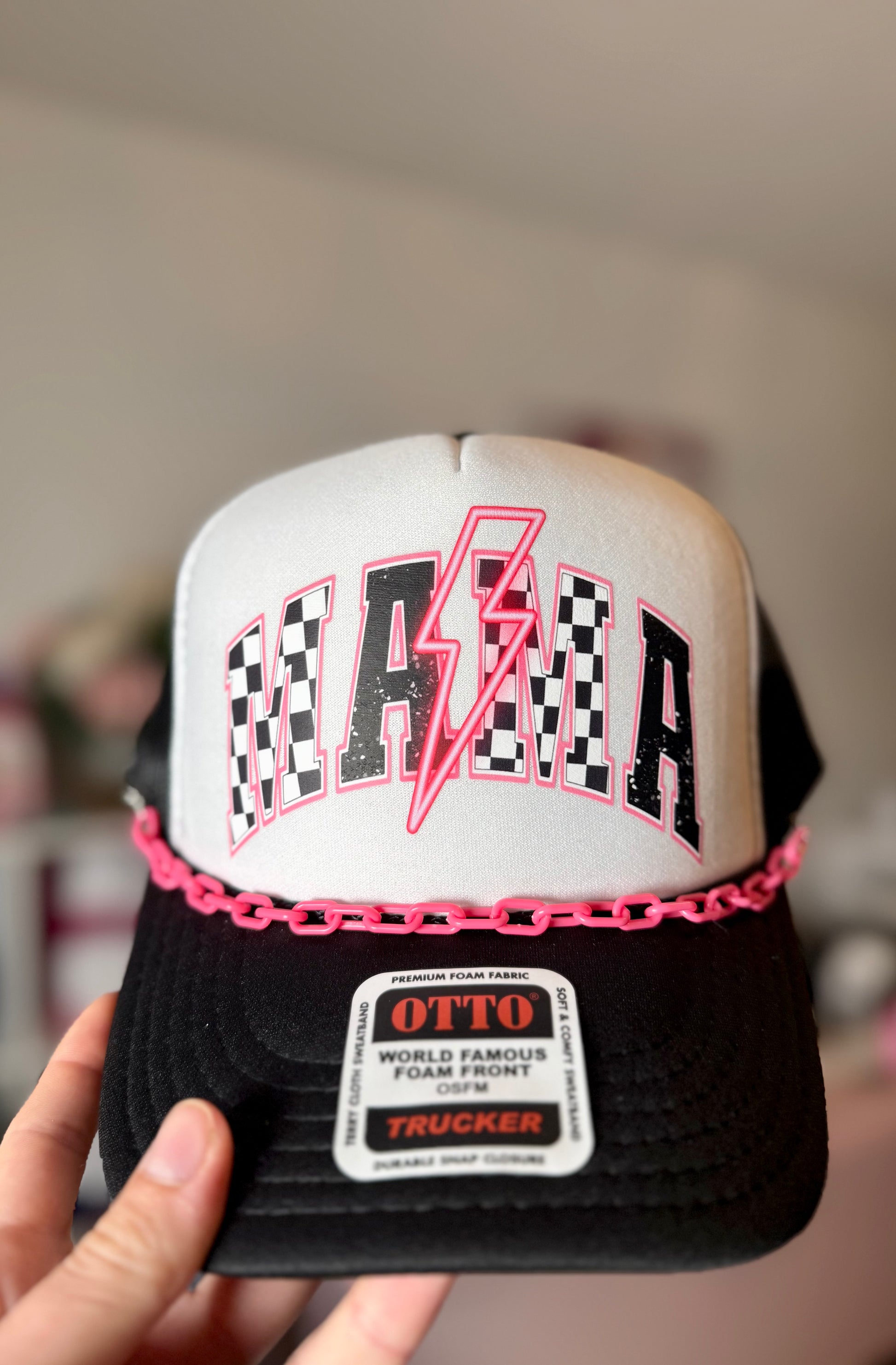 For the mama who’s equal parts wild, stylish, and unstoppable — this black and white trucker hat features a bold “MAMA” design with a hot pink lightning bolt and matching inner lining that brings the spark. Whether you’re running errands or ruling the carpool lane, this hat is your new go-to crown.