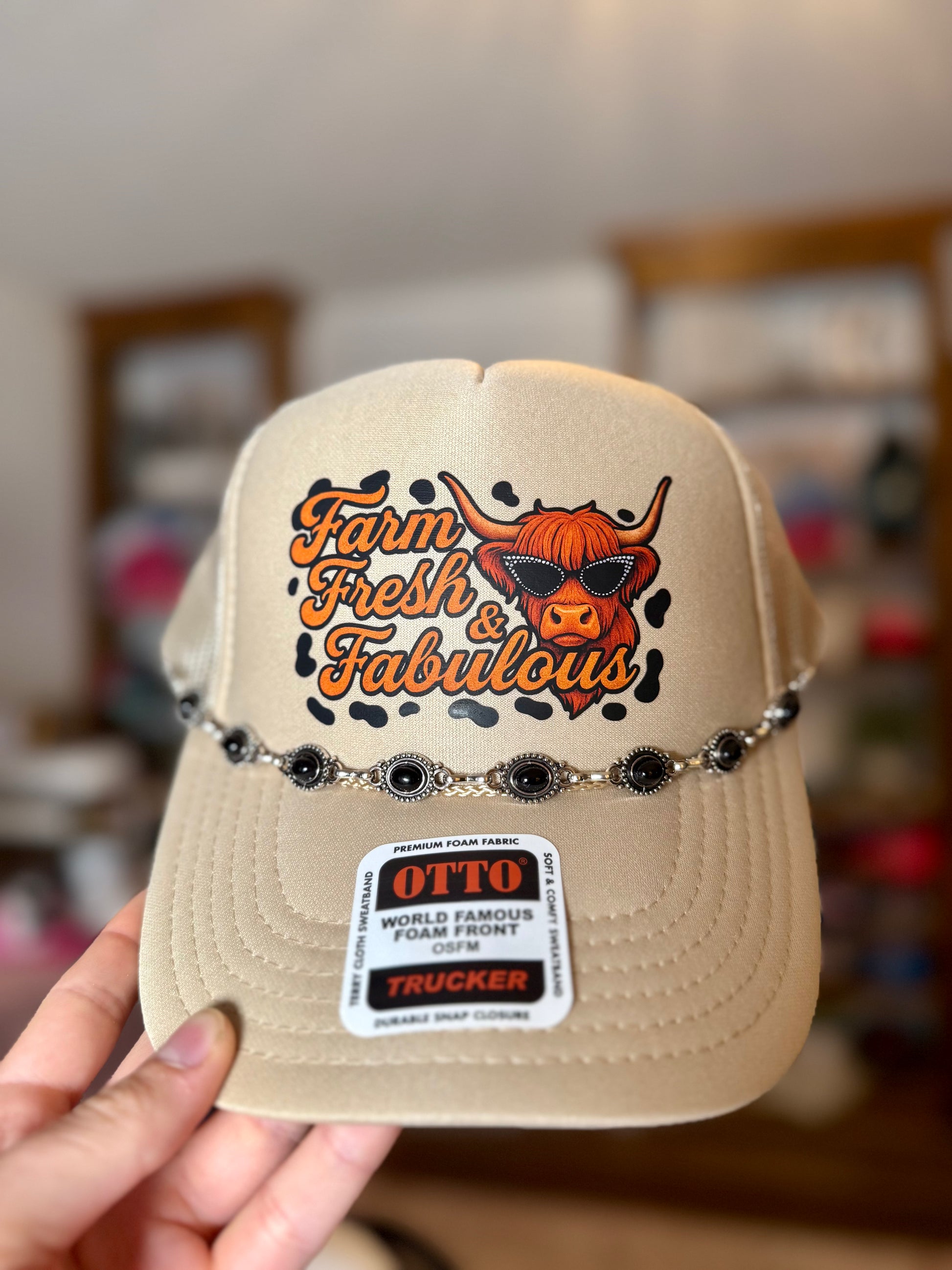 Ranch life never looked so glam! This all-tan trucker hat features a custom “Farm Fresh and Fabulous” design with a stunning Highland cow front and center — because farm girls can be muddy and fabulous. Topped off with a black-accented concho chain, this beauty brings western charm with a boujee twist.