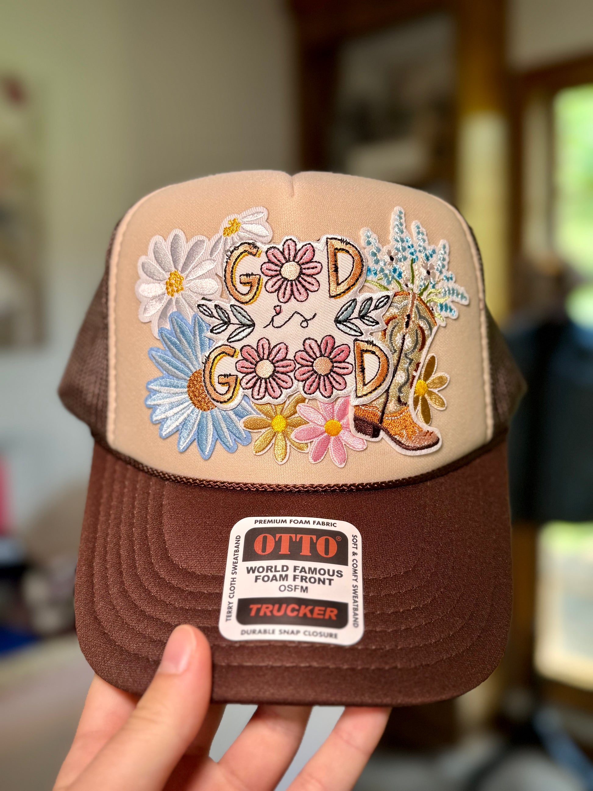 Spread positivity and style with our God is Good Trucker Hat 🌸✨. This brown-and-tan foam-front trucker hat features bold embroidered lettering surrounded by colorful daisies and a western-inspired boot for the perfect touch of country charm.