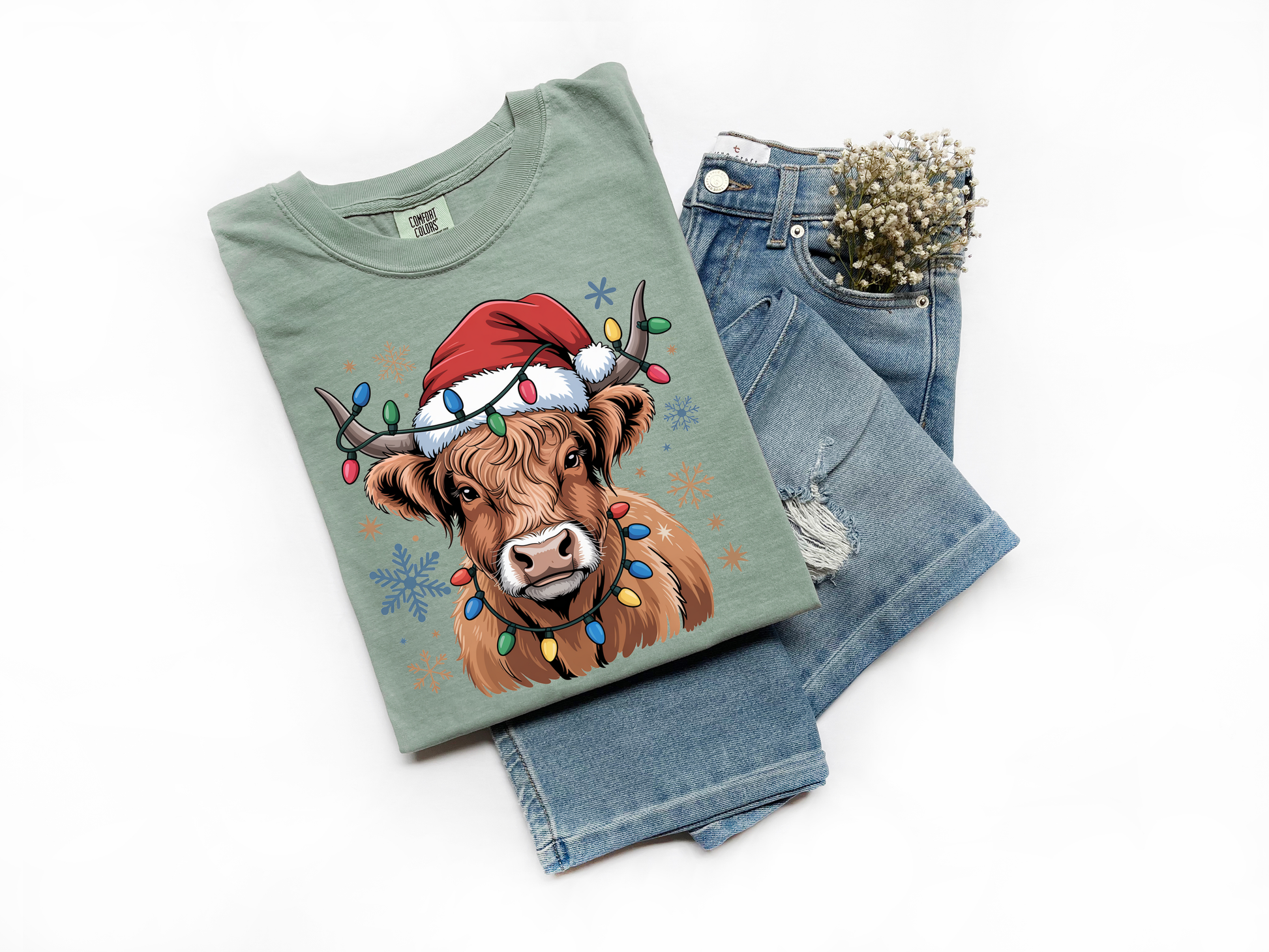 Get ready to light up the holidays with this Highland Cow Christmas Tee! 🎄 Featuring a festive Highland cow wearing a Santa hat and wrapped in colorful Christmas lights, this design is the perfect mix of cozy farmhouse charm and holiday cheer.