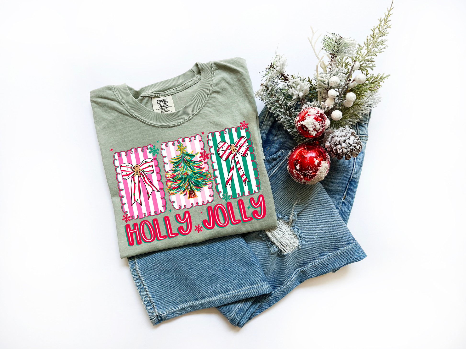 Make your season merry, bright, and oh-so-cute with our Holly Jolly Christmas Gifts tee! ππ This festive design features three cheerful gift boxes with bows, trees, and candy stripe accents β bursting with holiday color and charm. Perfect for anyone who loves pink, glitter, and a touch of boujee Christmas magic!