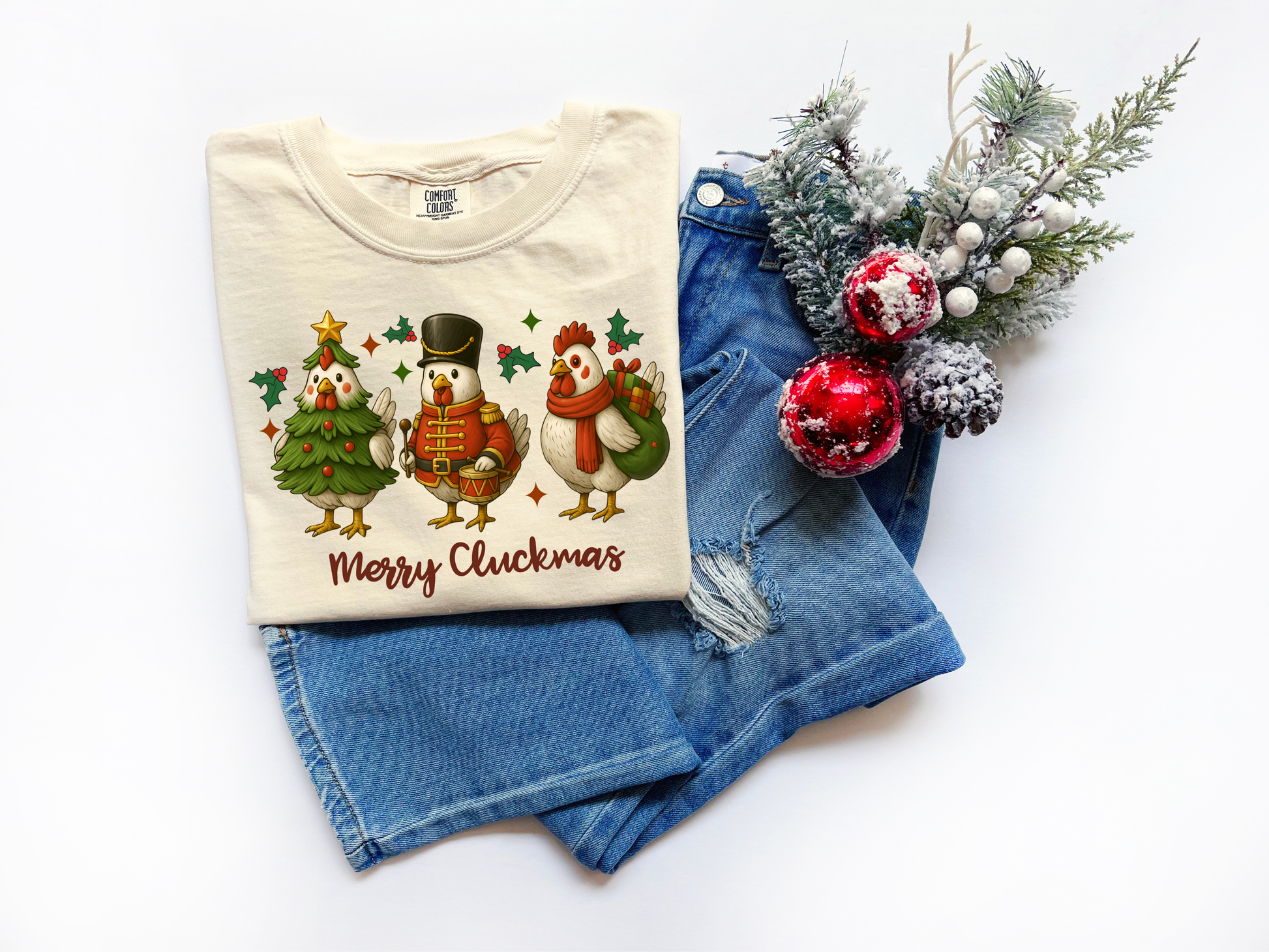 Get ready to cluck around the Christmas tree in this adorable Merry Cluckmas tee! 🎄🐔 Featuring three festive chickens dressed as a Christmas tree, a toy soldier, and a cozy scarf-wearing hen, this shirt is the perfect mix of farm charm and holiday cheer.
