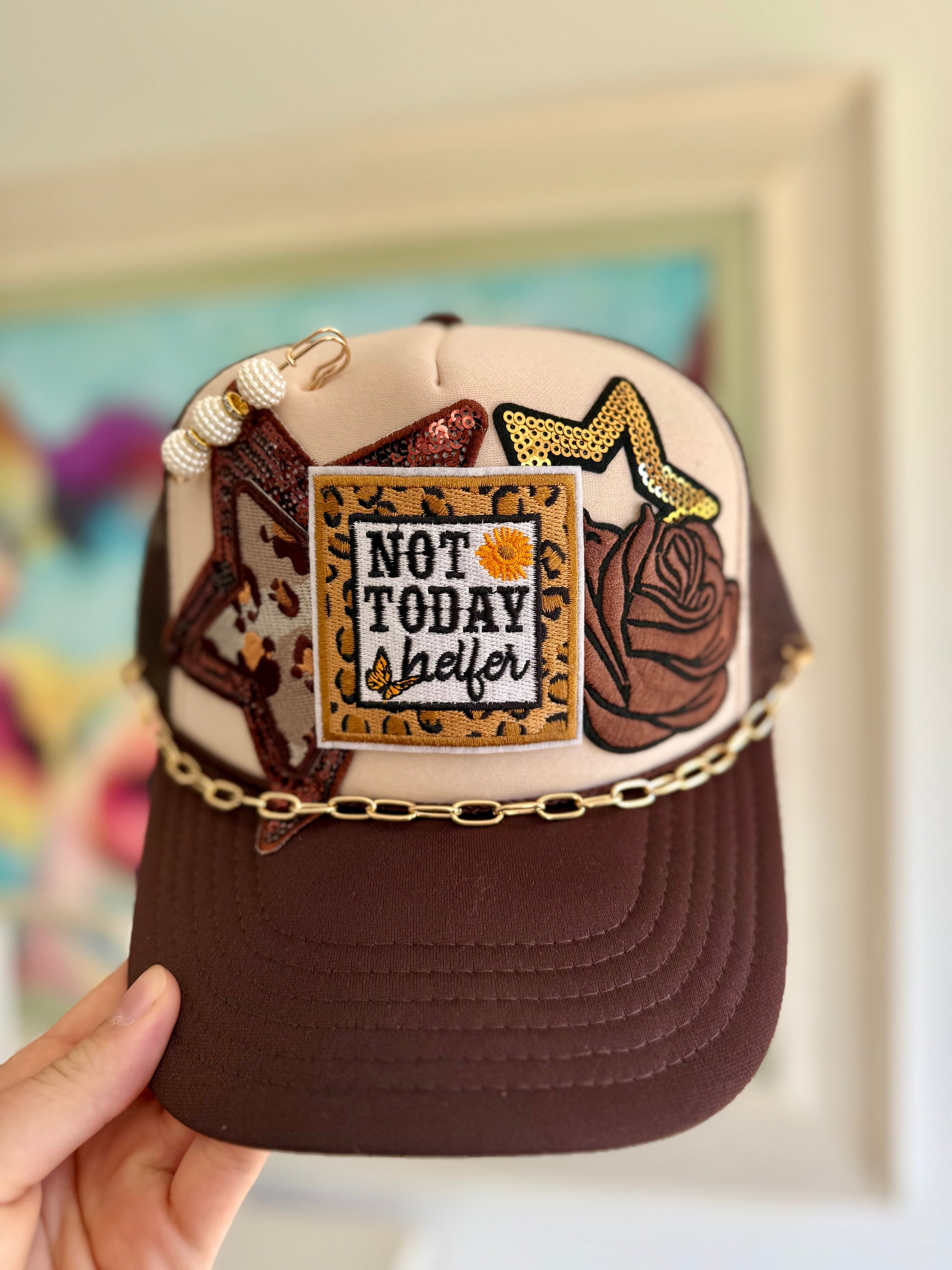 Featuring a tan and brown foam front with a bold leopard print patch, sequin accents, and a hand-placed gold chain, this hat radiates that “don’t mess with me” energy while still staying cute. The embroidered Not Today Heifer patch with sunflower and butterfly details adds the perfect pop of personality.