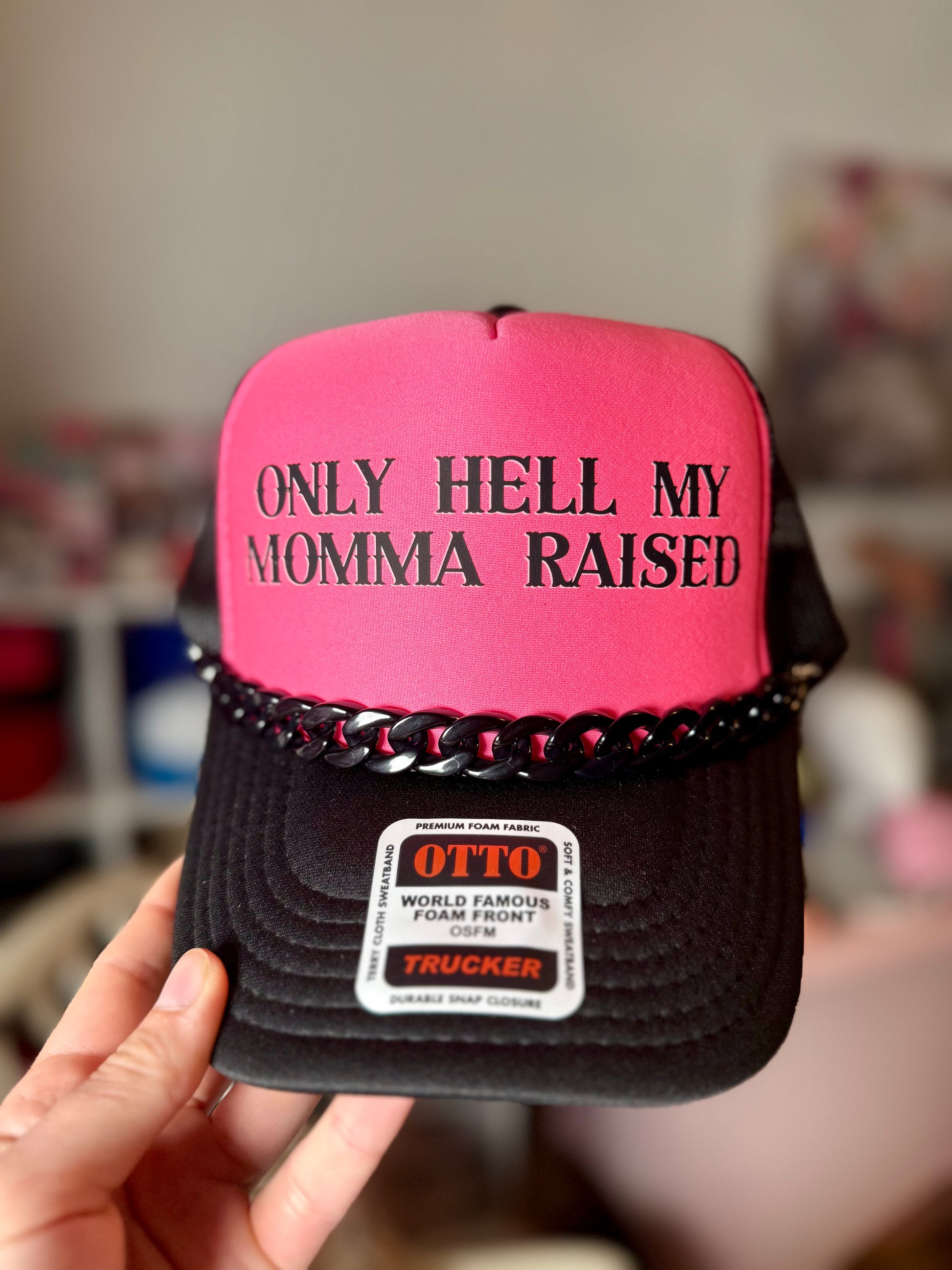 If attitude had a color, it’d be hot pink 💅 This fierce trucker hat brings the heat with its bold black-and-pink combo and an unapologetic patch that reads “Only Hell My Mama Raised.” It’s loud, proud, and made for the rebel hearts who were raised right — wild and free.