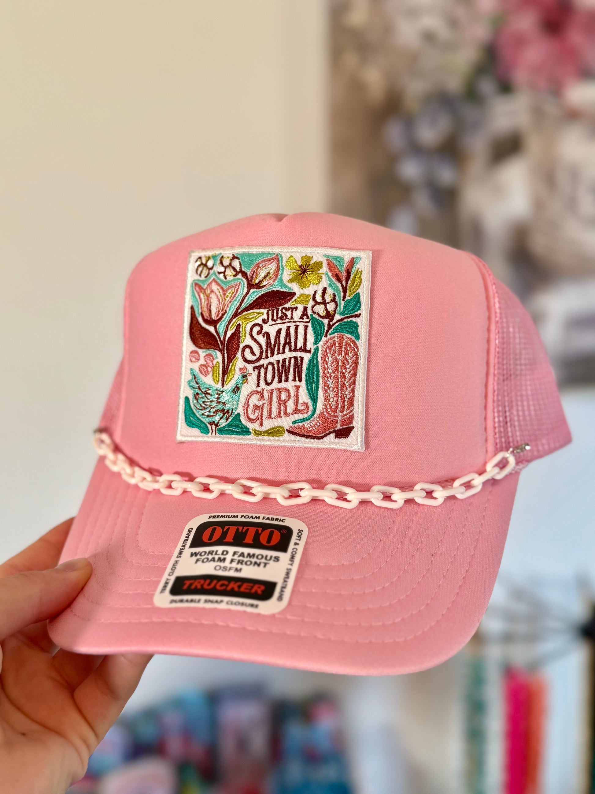 Southern sass meets small town charm in this blush pink beauty! Featuring a vibrant embroidered patch that reads “Just a Small Town Girl” with wildflowers and boots, this foam-front trucker hat is the perfect blend of sweet and spunky. The chunky white chain detail adds a glam twist to the classic country vibe—because small town girls can sparkle too!