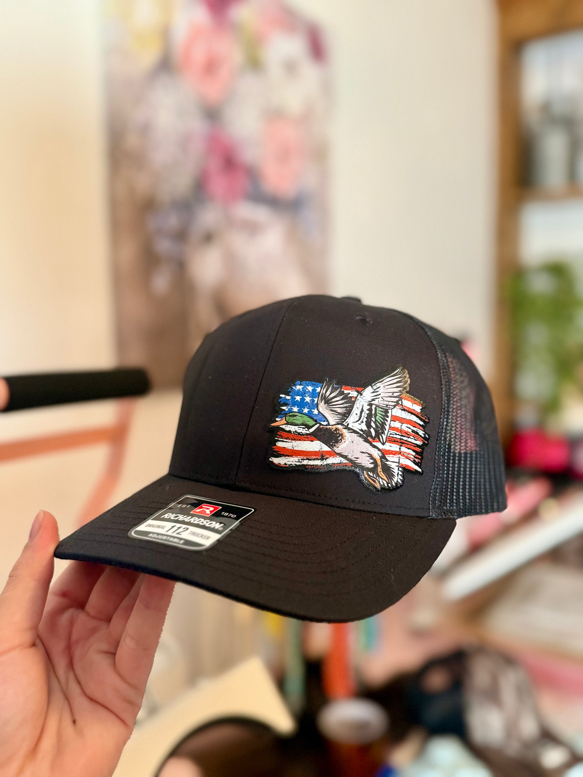 Fly high in all-American style with our Stars, Stripes & Duck Flights trucker hat. Featuring a bold embroidered patch of a flying duck over a distressed American flag, this black Richardson 112 hat is the perfect blend of country pride and outdoor grit. Whether you’re in the blind or just reppin’ your roots, this hat brings the heat.