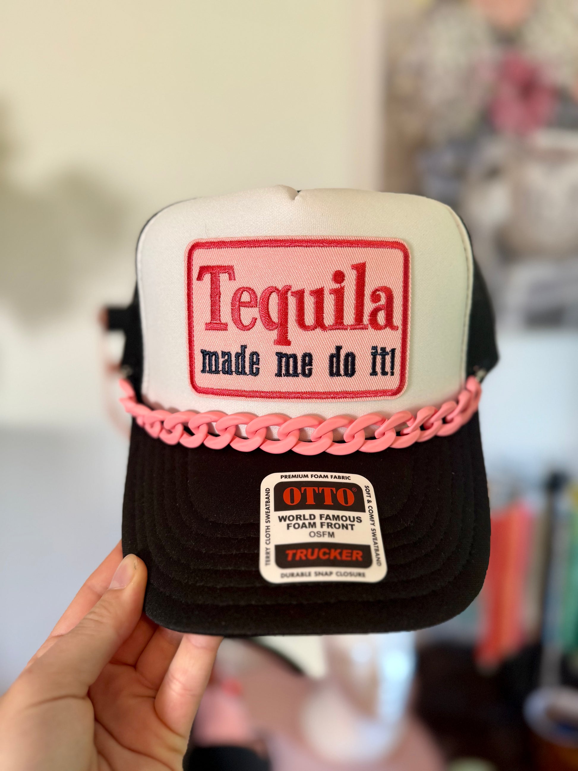 This spicy trucker hat is serving up sass with a statement patch that says “Tequila Made Me Do It” and a glam chain to match. The perfect mix of wild nights and western vibes, it's made for concerts, girls’ trips, taco runs, or just living your boldest life. Comfortable mesh back, adjustable fit, and 100% attitude.