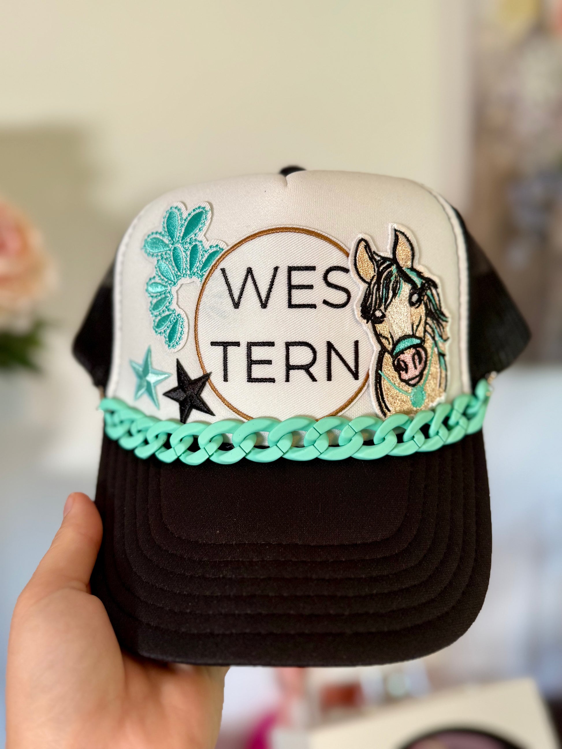 Saddle up in style with this bold and boujee trucker hat! Featuring a stitched “WESTERN” patch with a sassy horse, turquoise squash, and stars, this black and white beauty is finished off with a chunky mint chain that adds that perfect glam touch. It’s a whole cowgirl mood — no horse required.